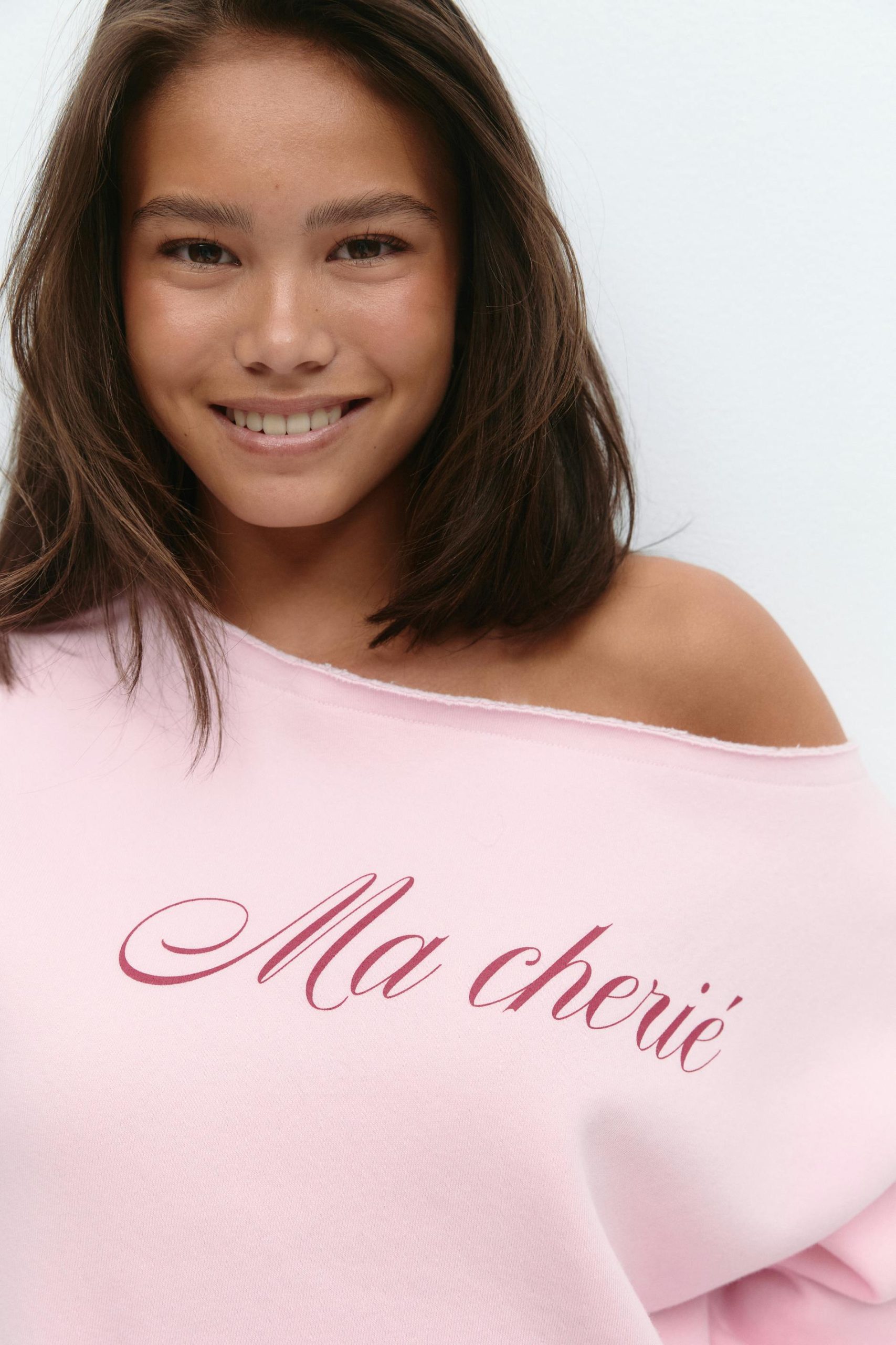 Blote schouder sweater met lange mouwen met tekst print aan de voorkant. De sweater is roze en heeft overmaatse pasvorm. Het heeft een boot halslijn, ruwe rand aan de bovenkant, kangeroezak aan de voorkant en ribbels aan de mouwuiteinden en aan de onderkant. Print met de tekst Ma cherié.