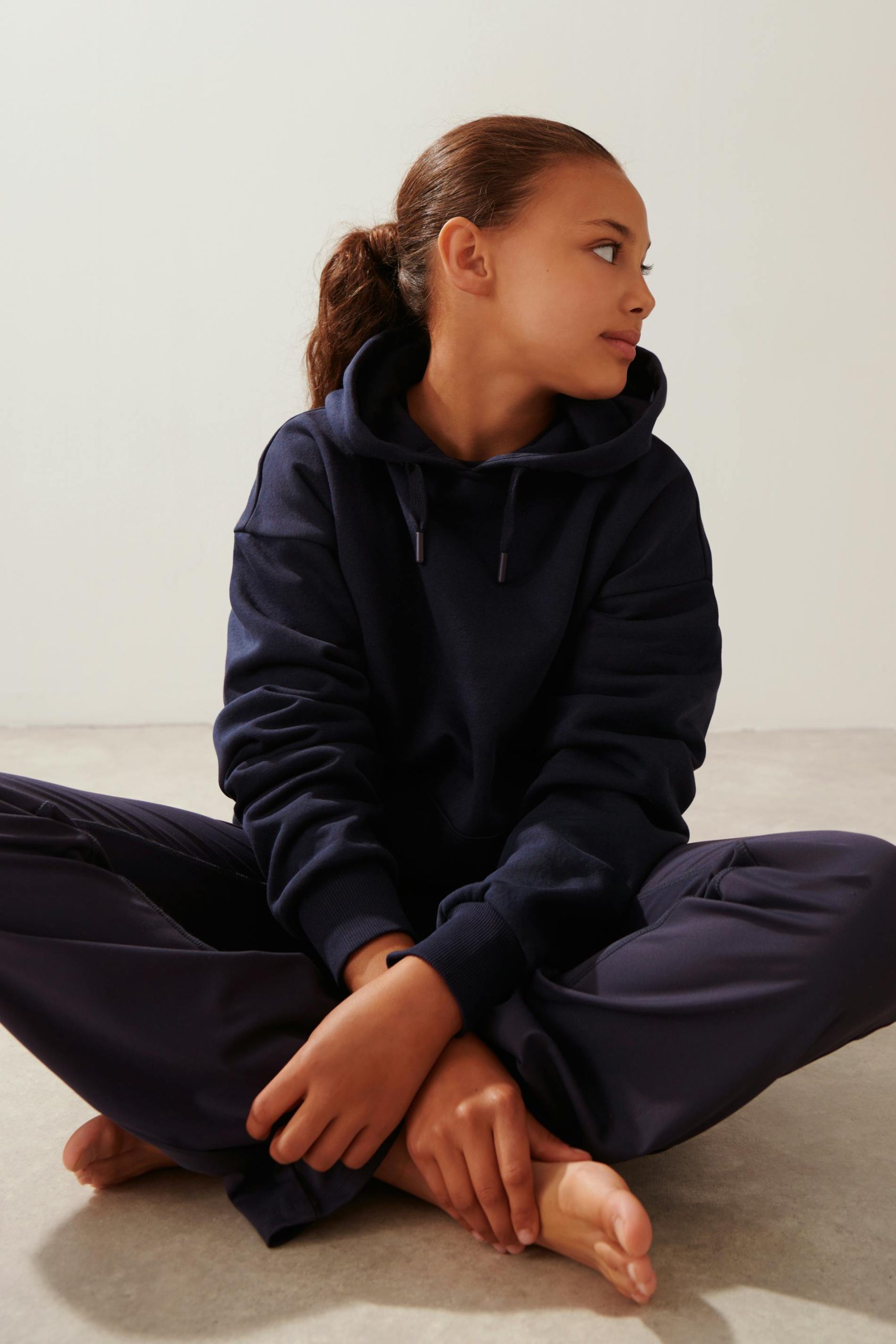 Hoodie van Gina Tricot Young met overmaatse pasvorm. De hoodie is marineblauw en heeft gevoerde capuchon met trekkoorden. Het heeft kangeroezakken aan de voorkant, lange mouw en ribbels aan de mouwuiteinden en aan de onderkant.