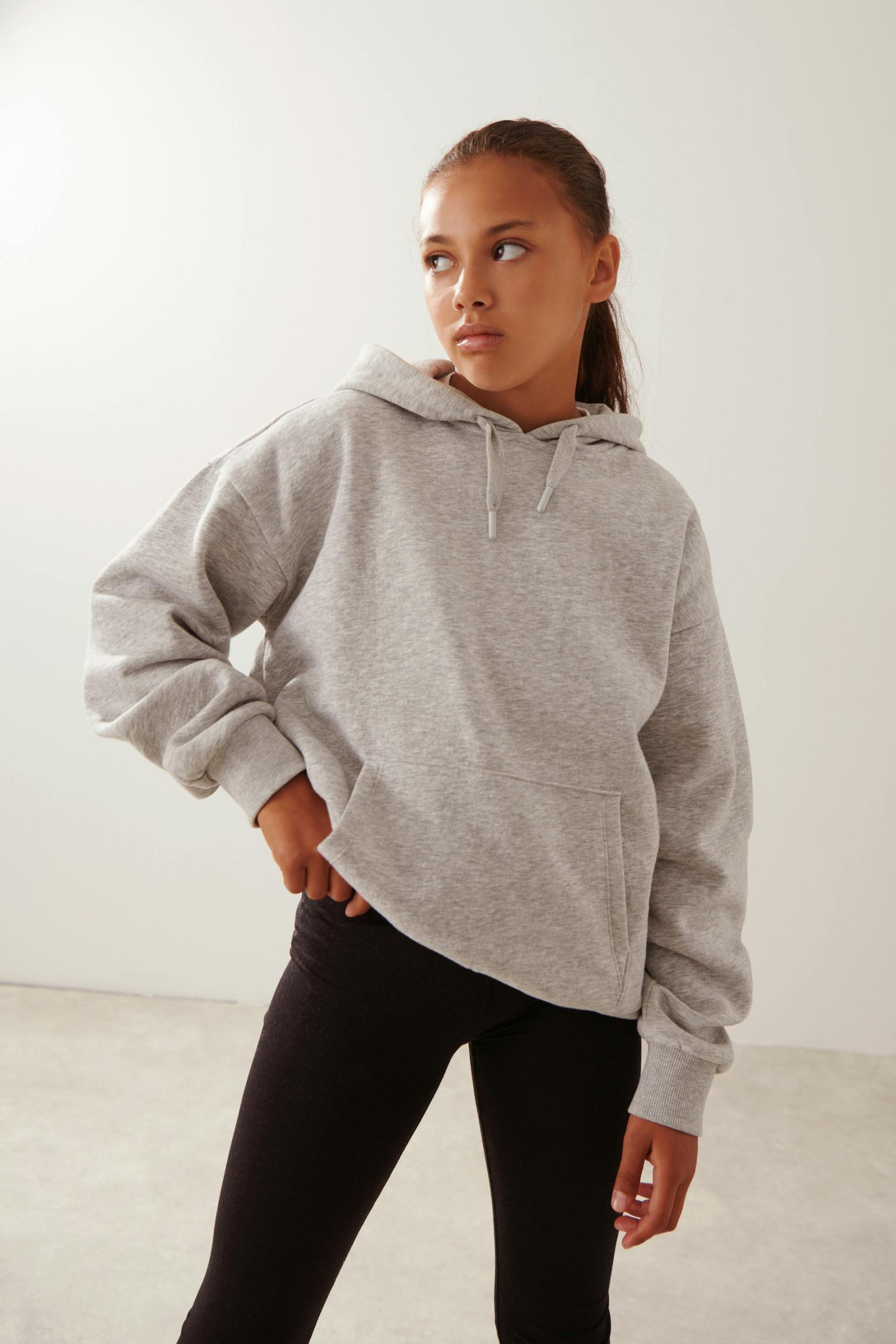 Hoodie van Gina Tricot Young met overmaatse pasvorm. De hoodie is grijs en heeft gevoerde capuchon met trekkoorden. Het heeft kangeroezakken aan de voorkant, lange mouw en ribbels aan de mouwuiteinden en aan de onderkant.