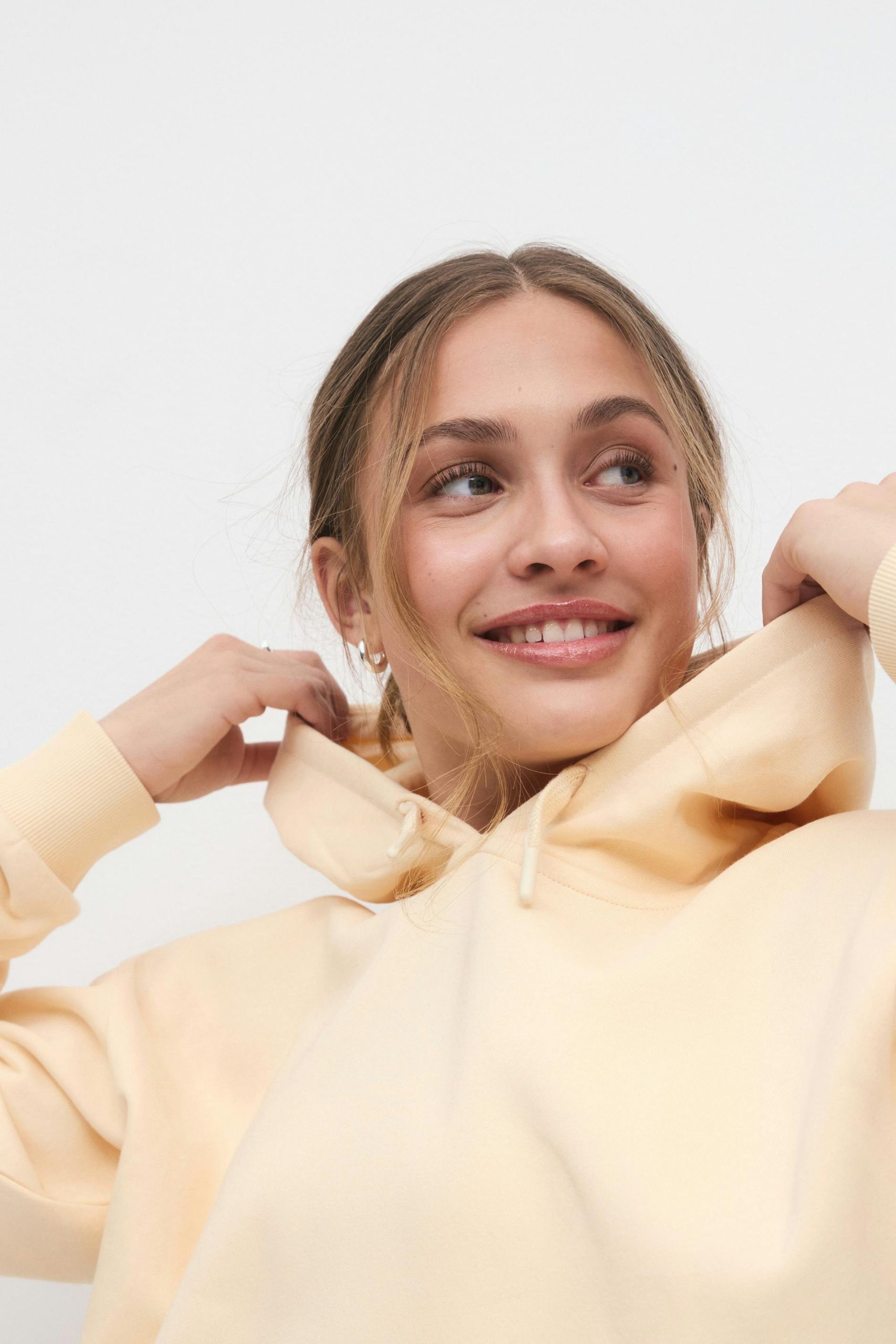 Hoodie met overmaatse pasvorm. De hoodie is geel en heeft gevoerde capuchon met trekkoorden. Het heeft kangeroezak aan de voorkant, lange mouw en ribbels aan de mouwuiteinden en aan de onderkant.