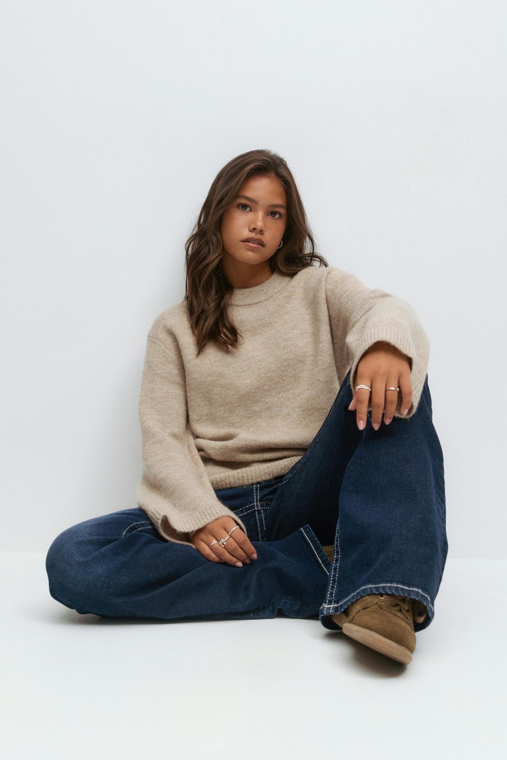 Gebreide trui met overmaatse pasvorm. De trui is beige en heeft ronde halslijn. Het heeft lange en rechte mouwen, normale lengte en geribd gebreid materiaal aan de mouwuiteinden en aan de onderkant.
