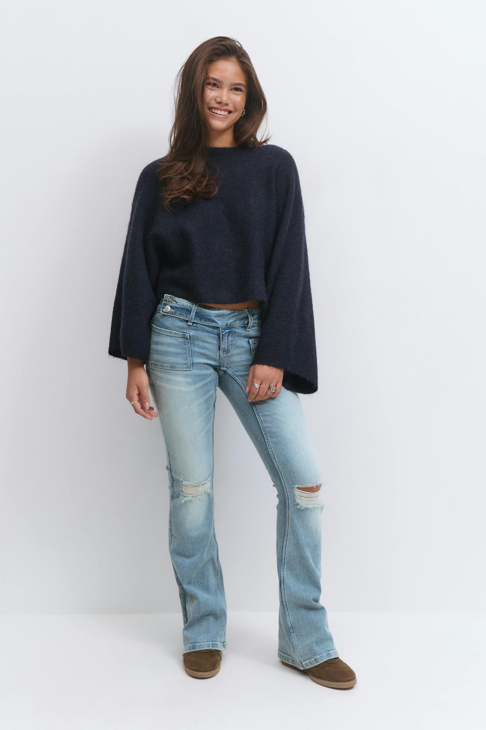 Flare jeans met gescheurde knieën. De spijkerbroek is blauw en heeft lage taille. Het heeft uitlopende pijpen met normale lengte, aanpasbare elastiek aan de taille, lage stretch, gulp, patch-voorzakken en achterzakken met een borduurwerk.
