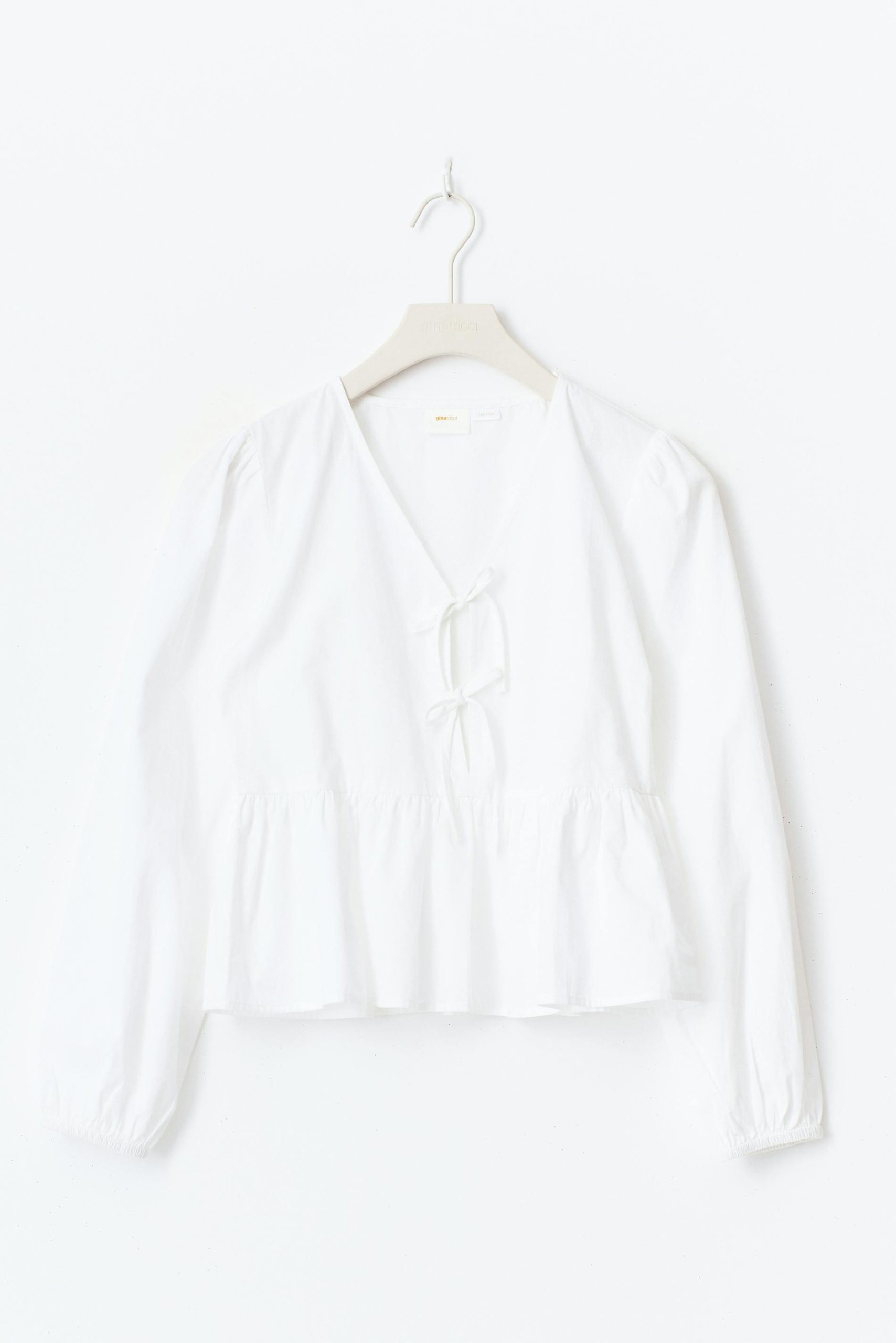 Bloes met lange pofmouwen. De bloes is wit en heeft knooptouwsluiting met strikken aan de voorkant. Het heeft ruimvallende stijl, gerimpelde naden aan de taille, v-hals, vergaringen rond de schouders en elastische manchettes.