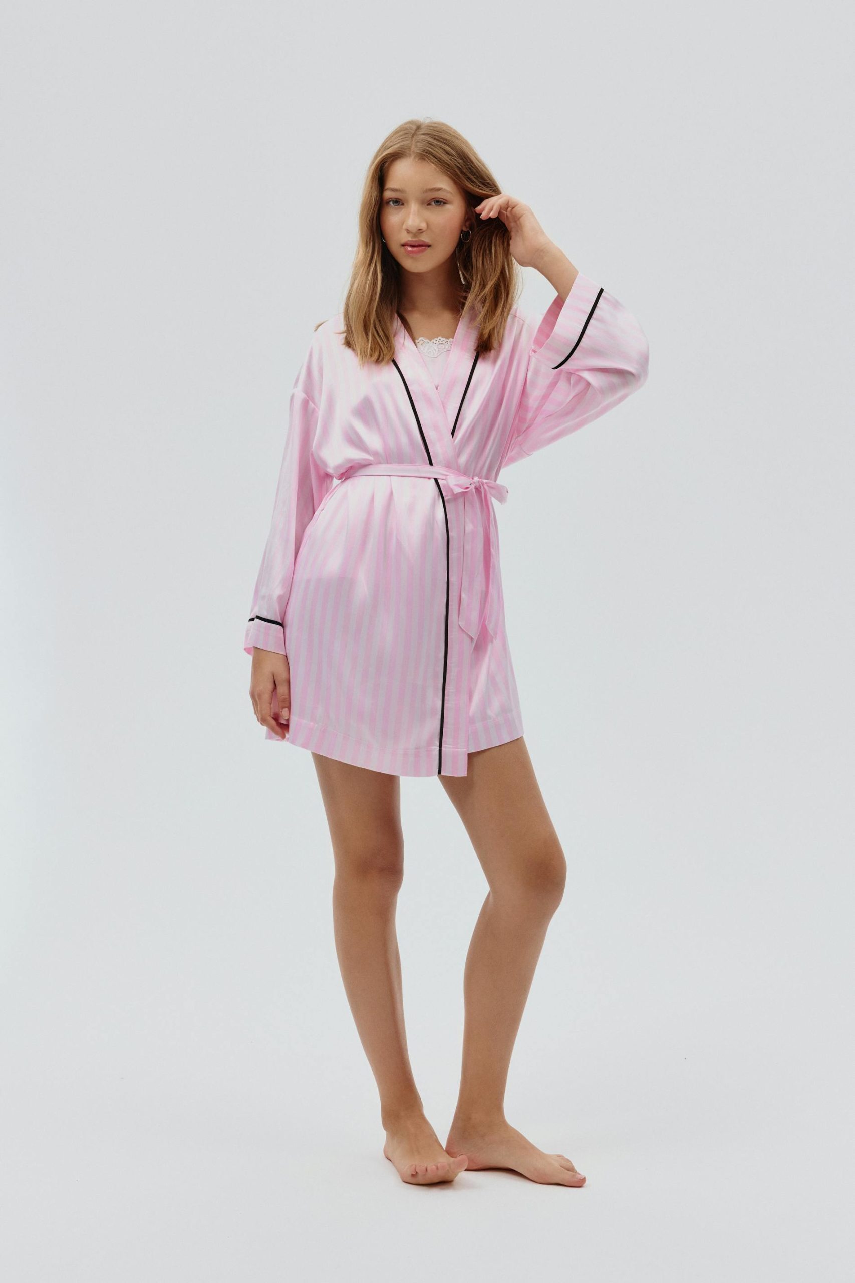 Gestreepte kamerjas van satijn met zelfbinder aan de taille. De kamerjas is roze en heeft ruimvallende stijl. Het heeft v-hals en lange en brede mouwen.