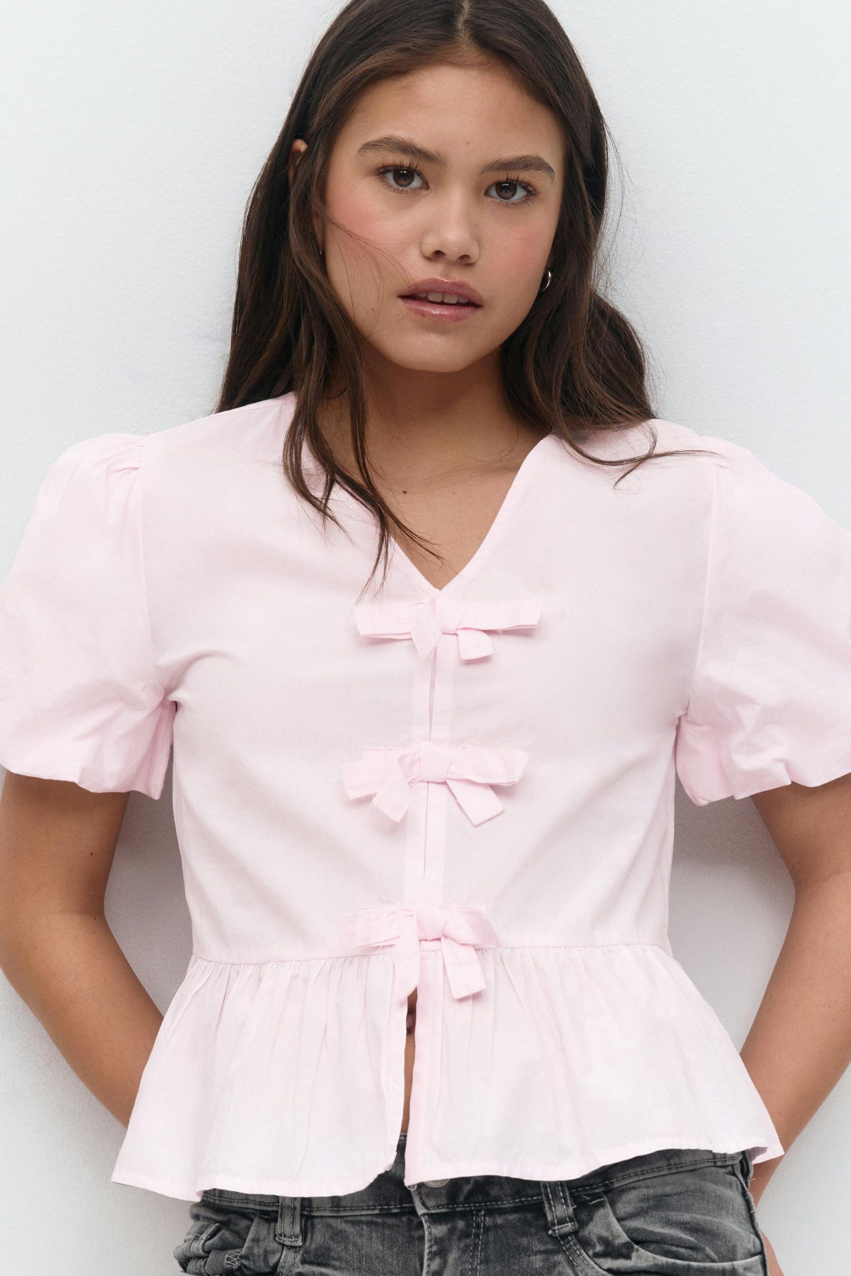 Peplum-topje met linten aan de voorkant. Het topje is roze en heeft korte pofmouw. Het heeft ruimvallende stijl, v-hals, gevoerde binnenkant, ruche aan de onderkant en spleet aan de voorkant.