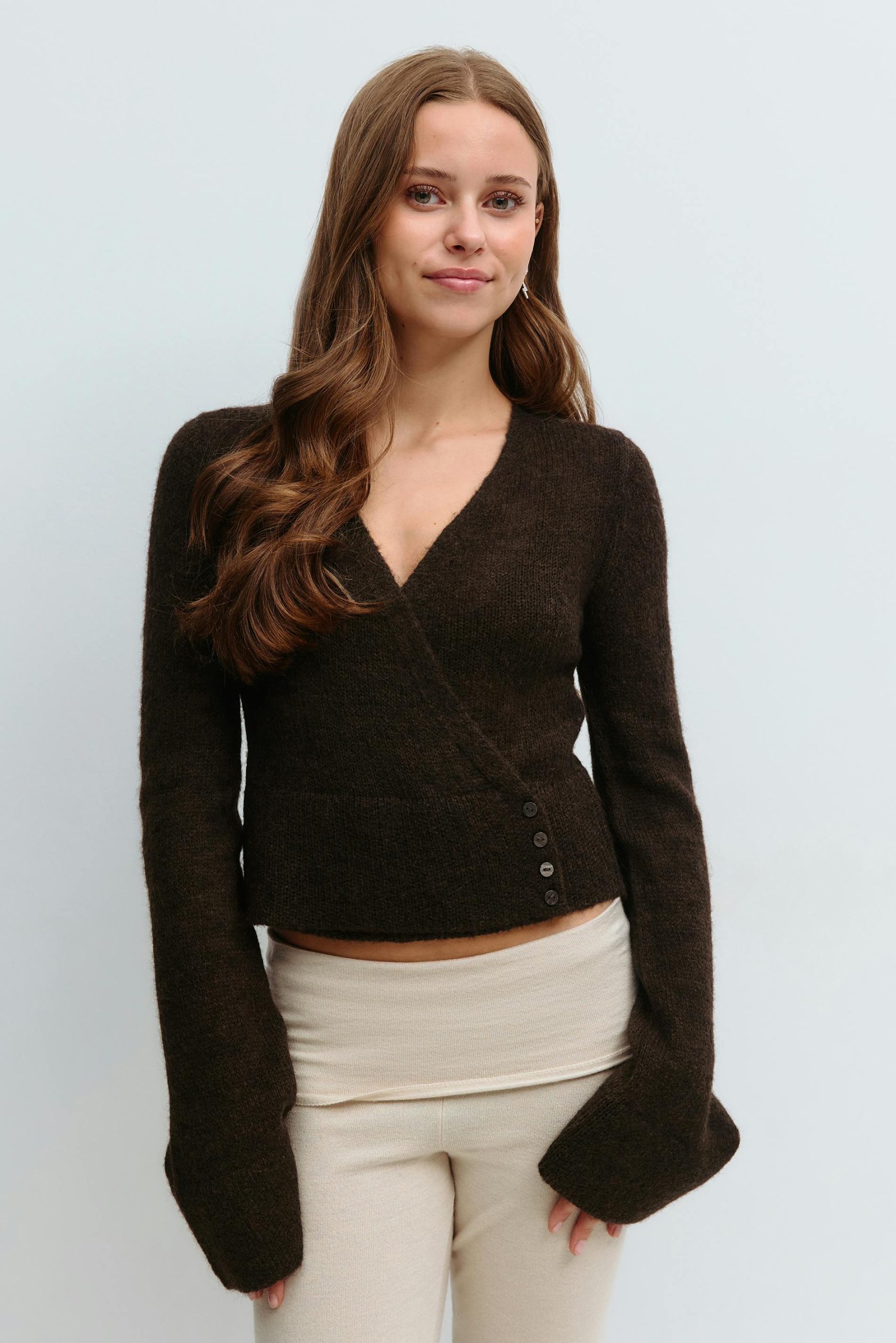 Gebreide trui met wikkel-ontwerp. De trui is bruin en heeft afgesneden lengte. Het heeft v-hals, lange mouw, knoppen aan de voorkant, normale pasvorm en geribbelde afwerkingen.