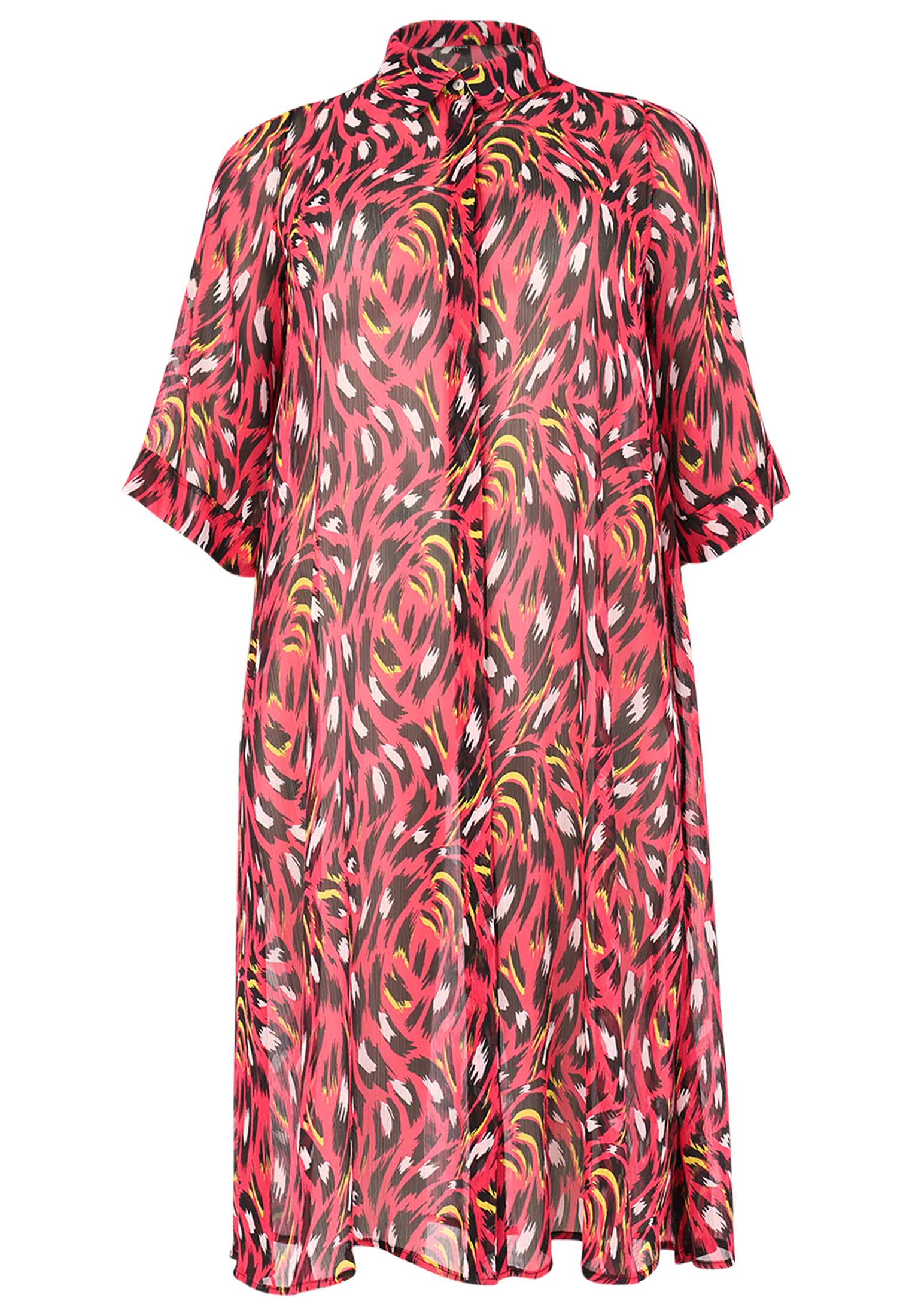 Lange blouse met een geknoopte voorkant. De blouse heeft een klassieke kraag en 3/4 mouwen. De blouse is niet gevoerd en gemaakt van voile.