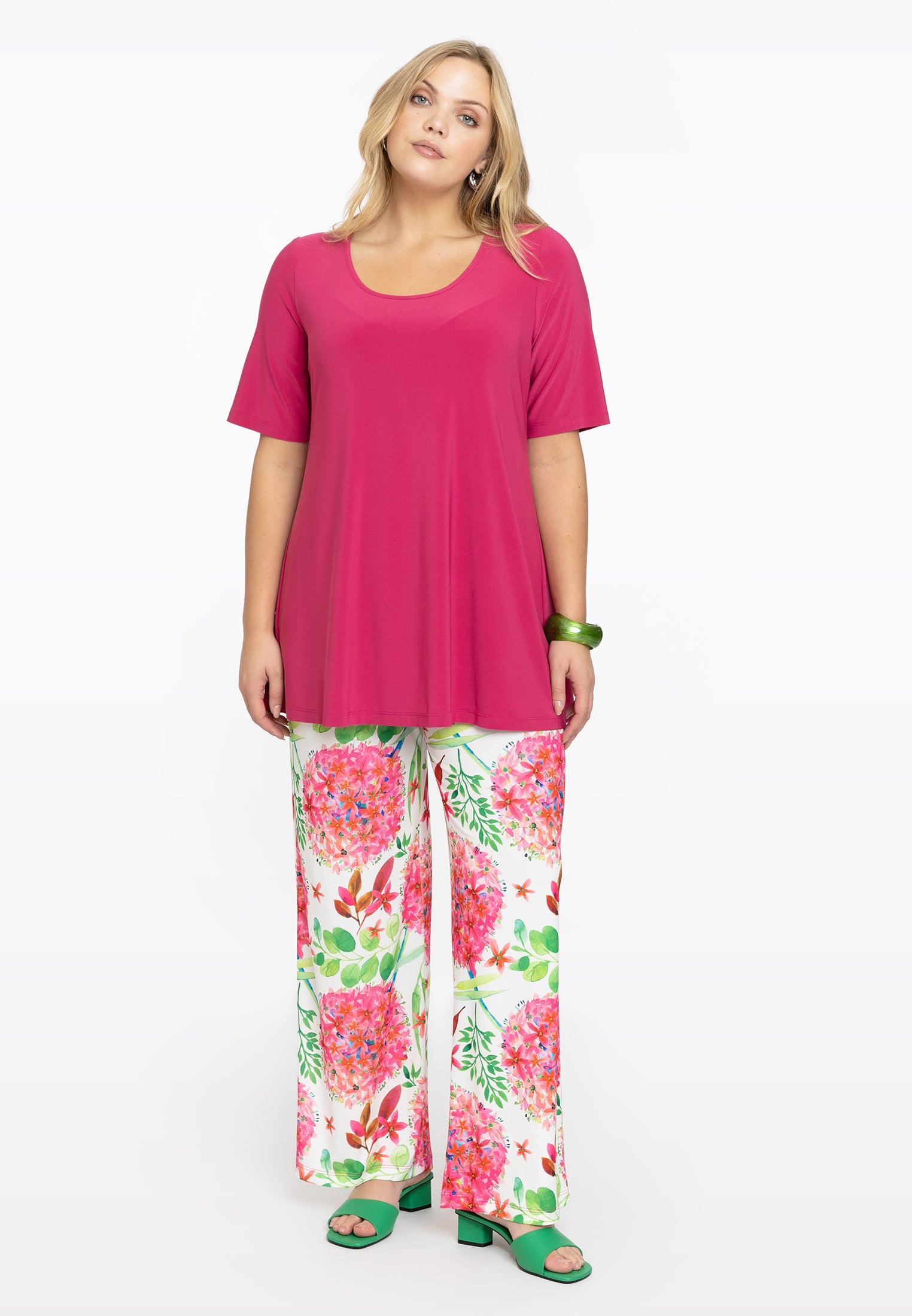 Met deze broek kun je werkelijk alle kanten op, omdat je hem met zoveel verschillende kleuren kunt combineren voor telkens weer een compleet andere look. De pantalon in een vrolijke, frisse bloemenprint heeft een comfortabele pasvorm door de wijde pijpen, elastische tailleband en de fijne dolce stof waar hij van gemaakt is.