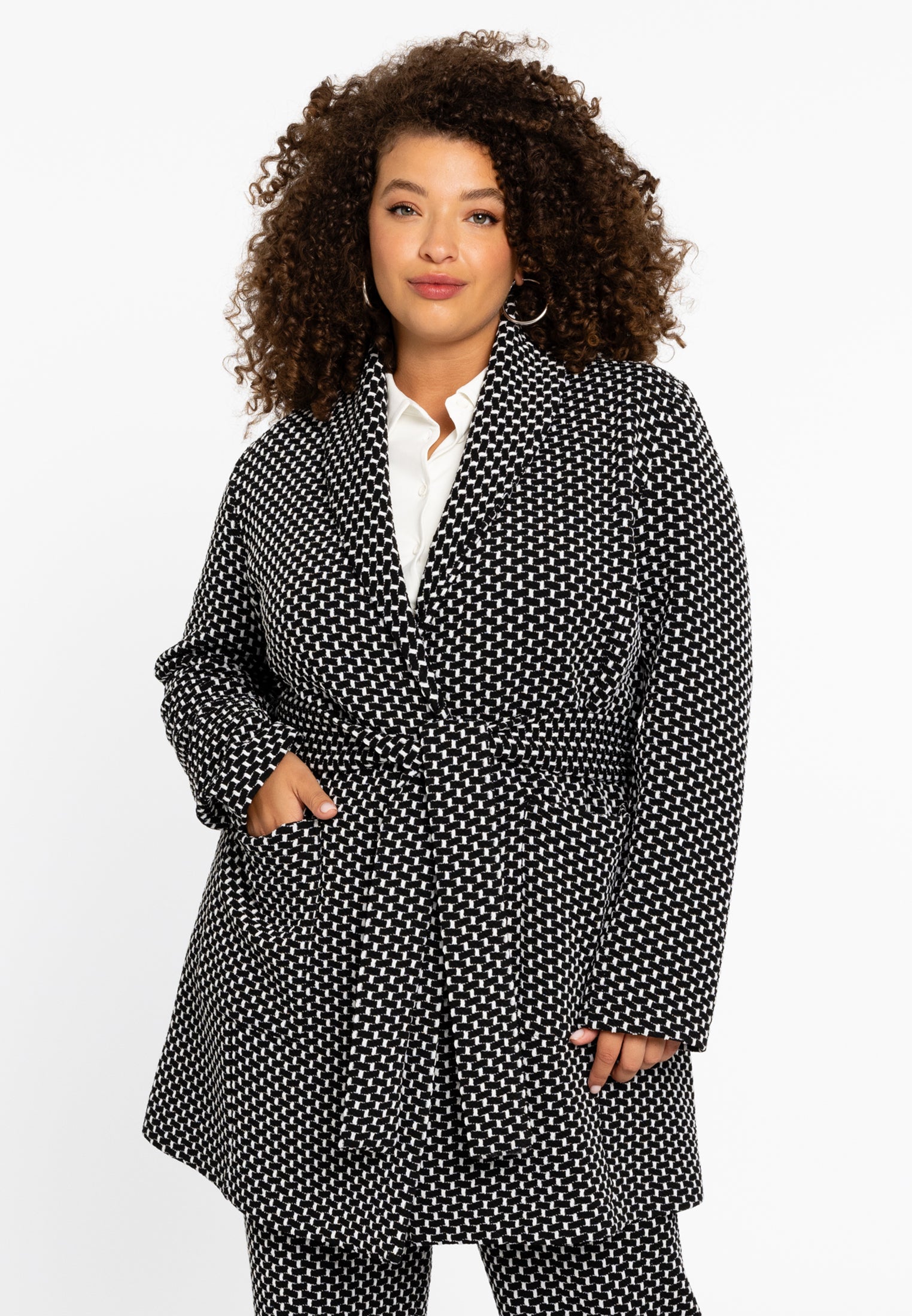 Dit chique jack heeft een opvallend zwart-wit patroon, dat moderne esthetiek combineert met klassieke charme. De zachte jacquardstof biedt warmte zonder in te leveren op ademend vermogen, waardoor het perfect is voor overgangsseizoenen. Met een flatterende tailleband, snoert dit jack in om uw silhouet te verbeteren en biedt het een relaxte pasvorm. De diepe zakken zorgen voor extra praktisch gemak, zodat u uw essentials bij de hand kunt houden.