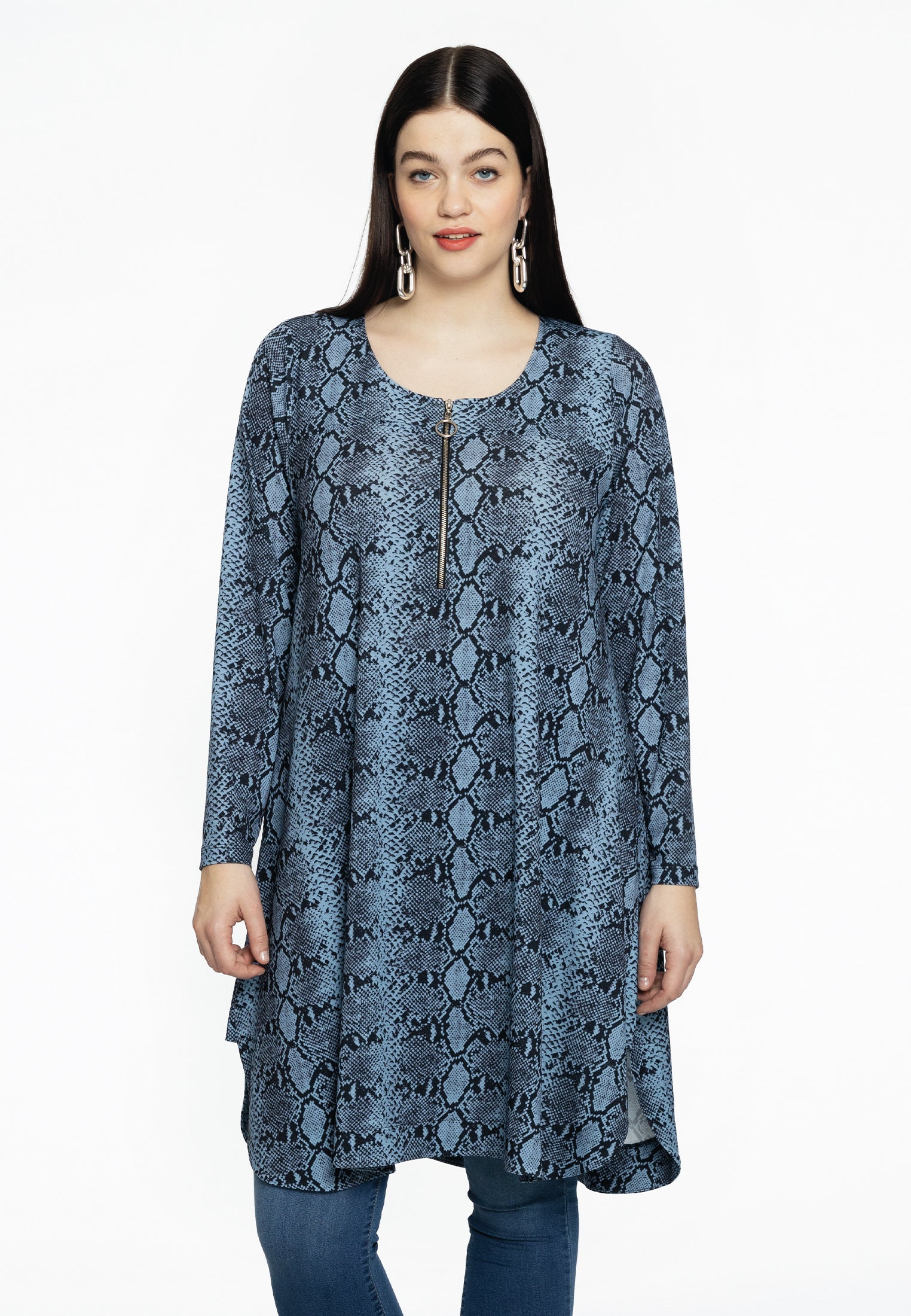 Wissel je favoriete klassieke leopard in voor een gekleurd snake design. Dit lichtblauwe item is vervaardigd van het dolce materiaal en heeft een A-lijn pasvorm. De halslijn is voorzien van een zilveren rits met ronde pull. De jurk heeft splitten aan beide kanten, mede als een afgeronde zoom. Draag het als een jurk wanneer je niet zo lang bent of als een tuniek met een skinny jeans of broek.