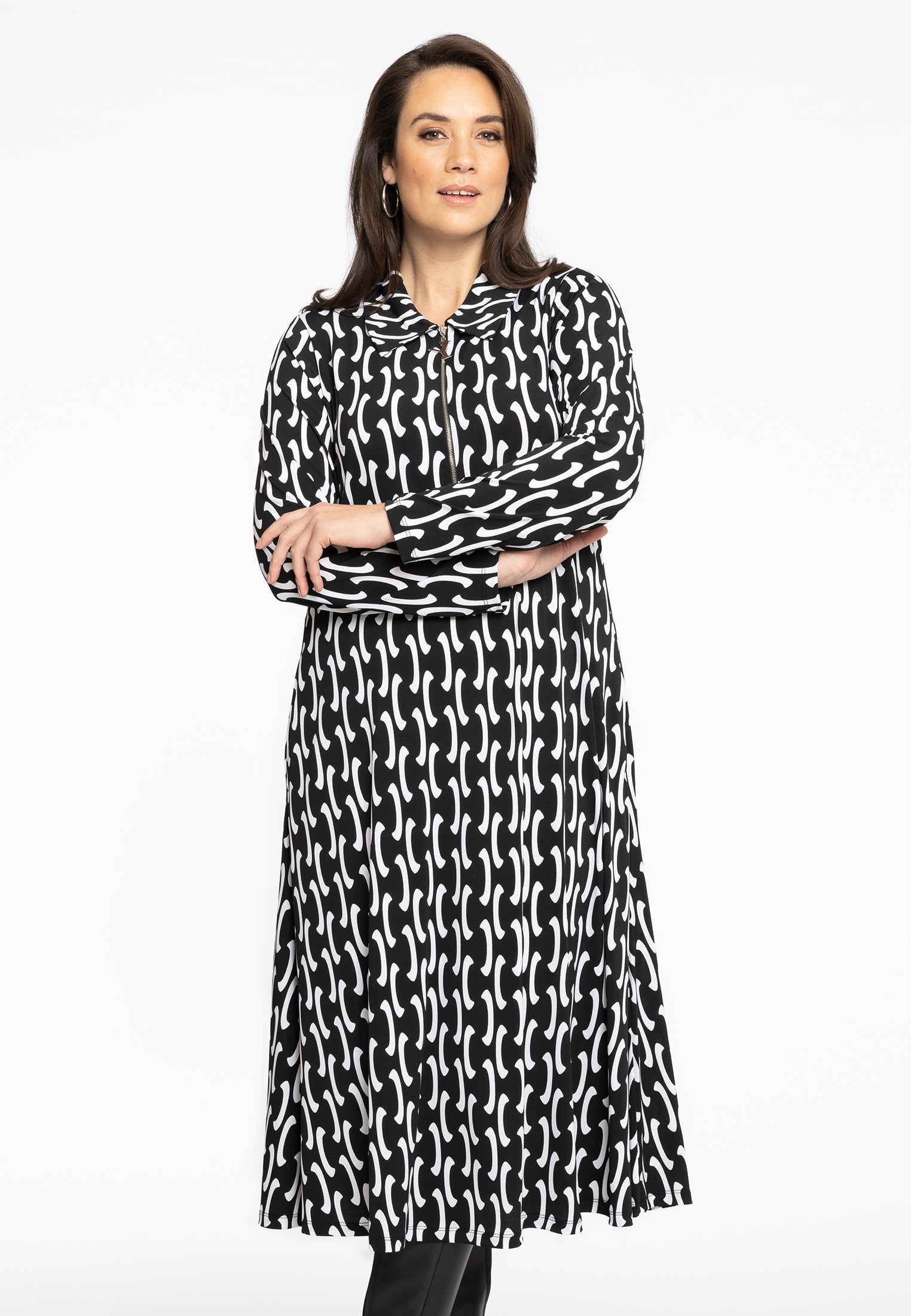 Deze jurk met lange mouwen is versierd met een zwart-witte geometrische print. Gemaakt van de comfortabele dolce stof, waardoor deze jurk makkelijk te dragen is. De jurk is afgewerkt met een klassieke kraag met een zilveren Y-rits, voor net dat beetje extra. En om deze jurk nog mooier te maken; het heeft zakken!