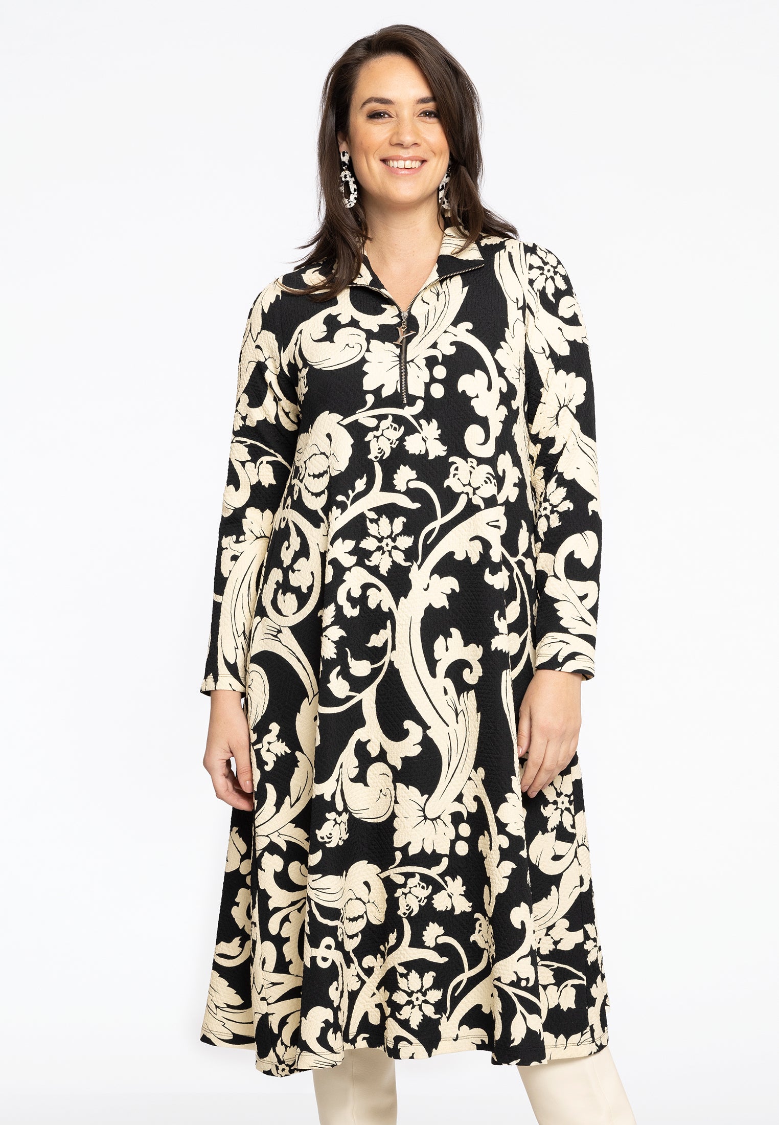 Versierd met een prachtige monochrome paisleyprint is deze stijlvolle jurk. De jurk heeft een wijde A-lijn pasvorm en knielengte. Het heeft een halslijn met ritssluiting versierd met een gouden “Y”. Door het dikke rekbare materiaal is hij perfect om in de winter te dragen.