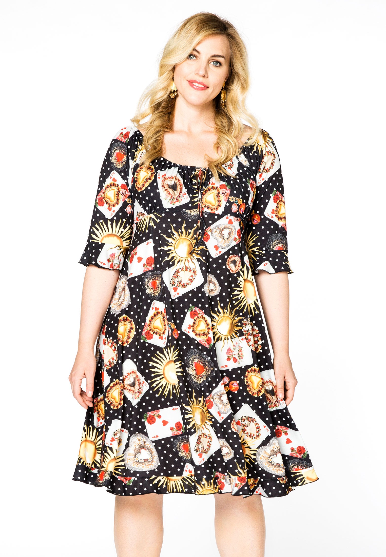 Je kunt niet kiezen welke kaarten je krijgt, maar je kunt wel kiezen voor deze prachtige jurk! De jurk heeft een wijde hals met een koordje en kan ook off-shoulder gedragen worden.
