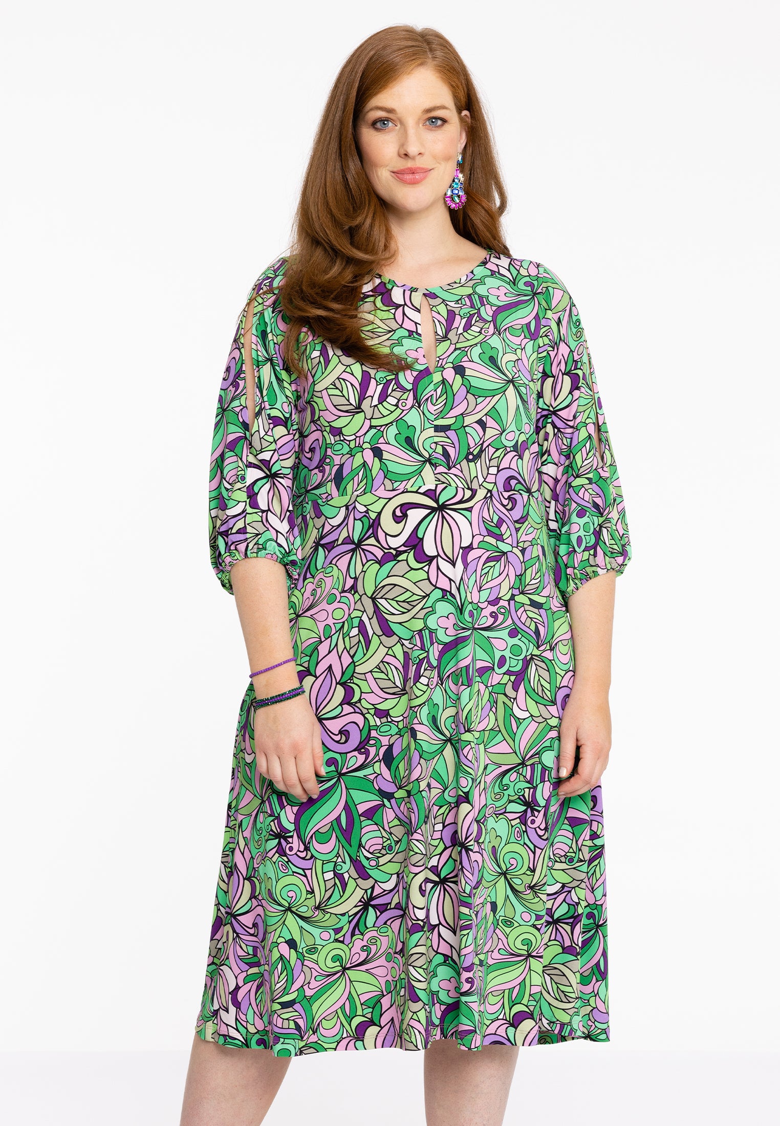 Trek voor je volgende speciale zomerse gelegenheid deze chique jurk aan. Dit item heeft 3/4 mouwen en een ronde hals die beide uitgesneden details hebben. De jurk is gemaakt van dolce travel materiaal en heeft een zwierige A-lijn pasvorm.