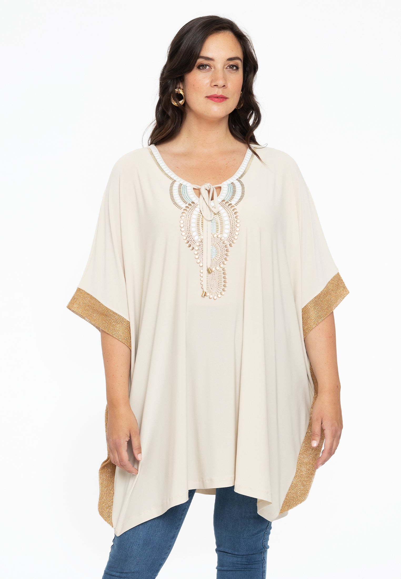 Kies voor de boho chic stijl met deze zomerse tuniek, voorzien van studs en mini-diamantjes. De vierkante tuniek is gemaakt van het dolce materiaal en heeft biezen van goud mesh aan de zijkanten. Een faux-leren koord met kralen en glinsterende stenen siert de halslijn.