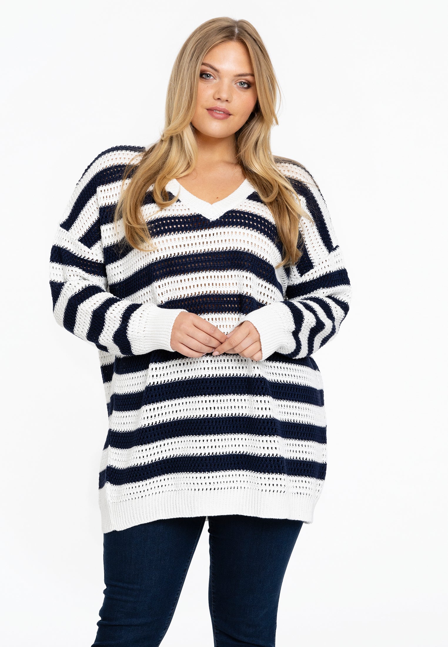 Trendalert; gestreepte truien! Deze marineblauwe trui is heerlijk voor de frisse dagen in het vroege voorjaar. Gemaakt van een katoenmix. Het heeft lange mouwen, een ronde hals en is gedetailleerd met witte strepen. Combineer met een jeans voor een casual look.