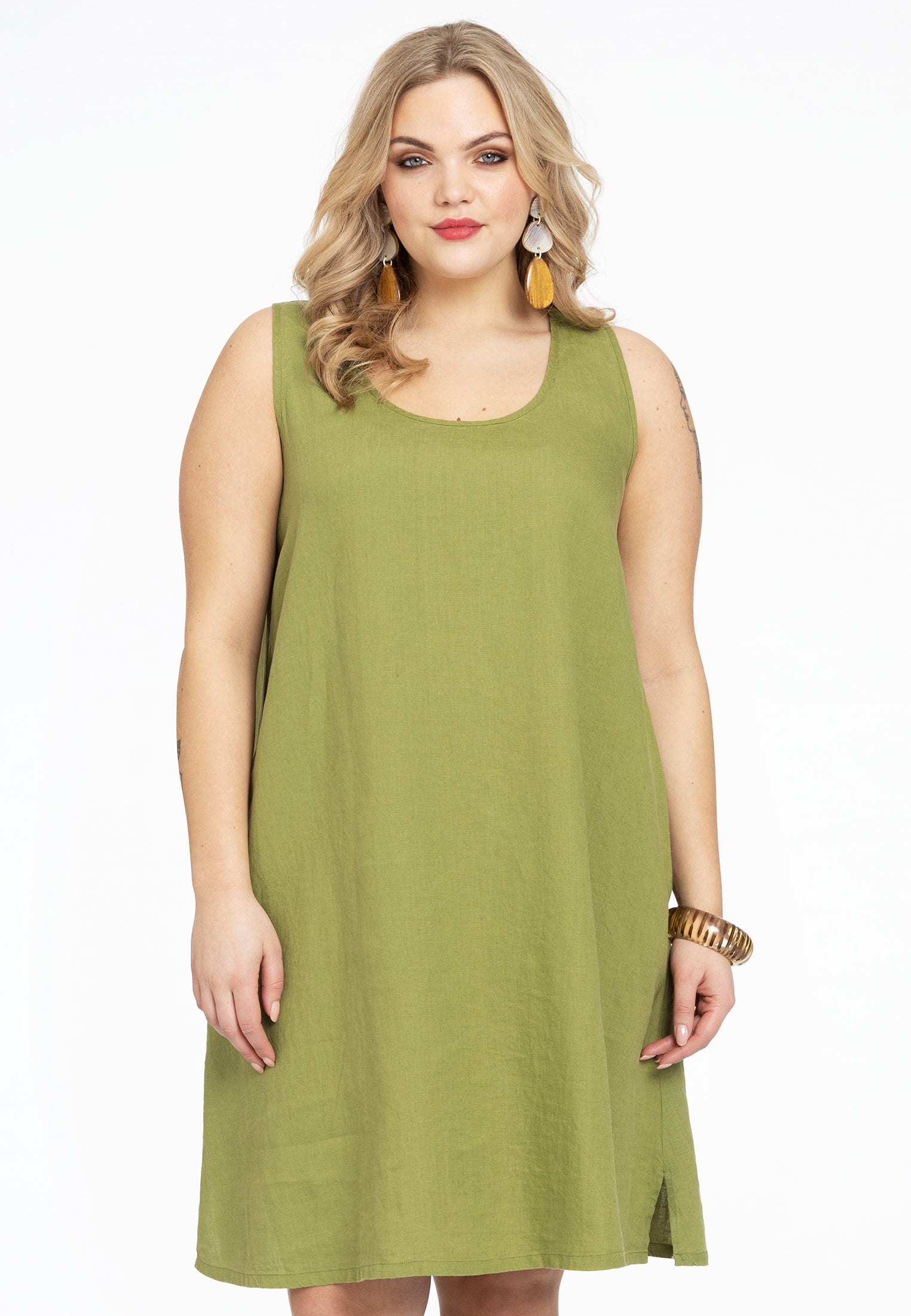 Vervaardigd van puur linen is deze A-lijn jurk, een tijdloze musthave voor warme dagen. Het mouwloze item heeft een ronde halslijn, splitjes aan de zijkant en kan dan wel zo gedragen worden of onder een cardigan.