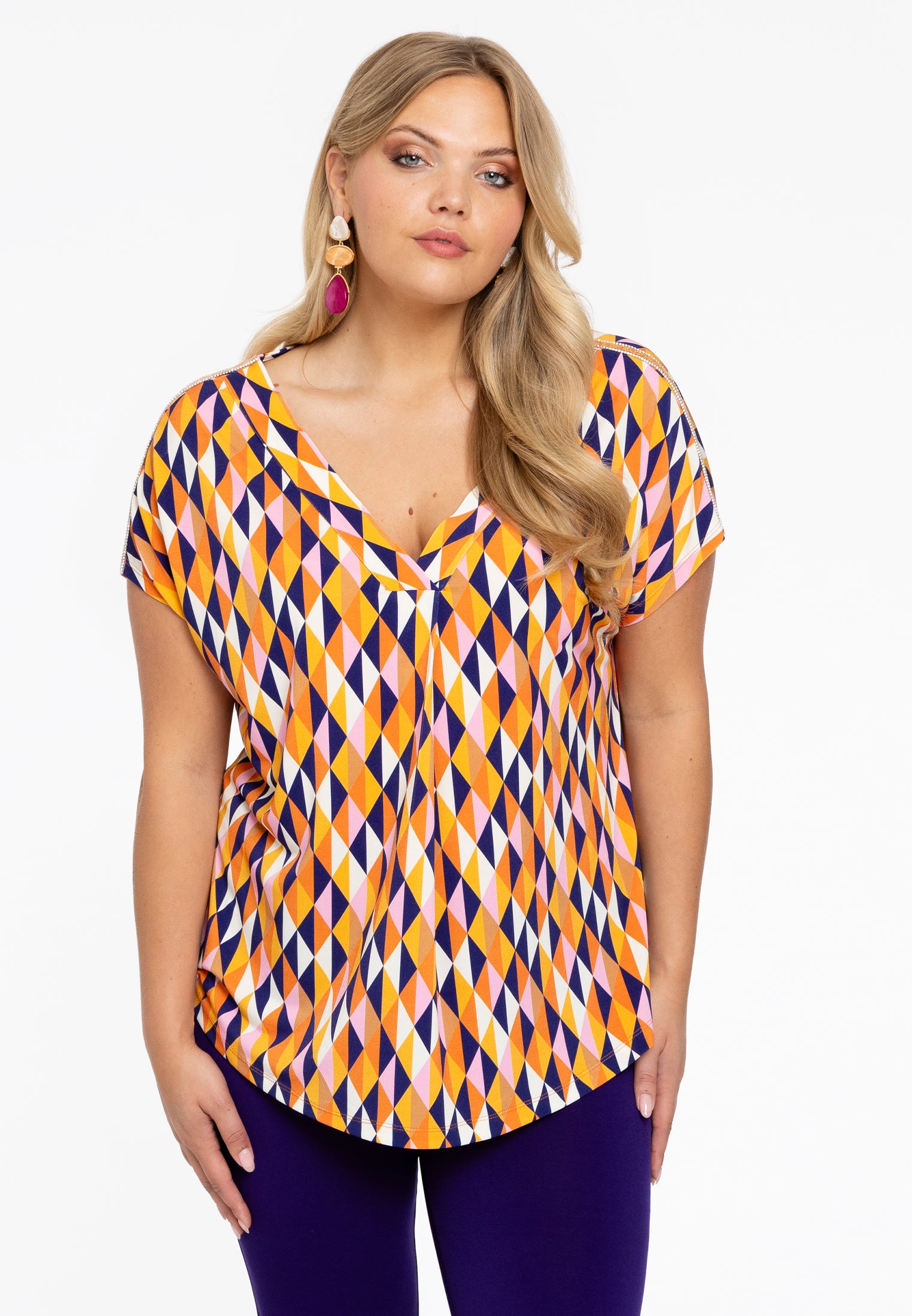 Geef je zomergarderobe een boost met dit chique en speelse kledingstuk. Deze tuniek is gemaakt van luxe dolce-stof en heeft een opvallende oranje en paarse geografische print. De korte mouwen en V-hals versterken het luchtige silhouet, waardoor het een ideale keuze is voor dagen met warm weer.
