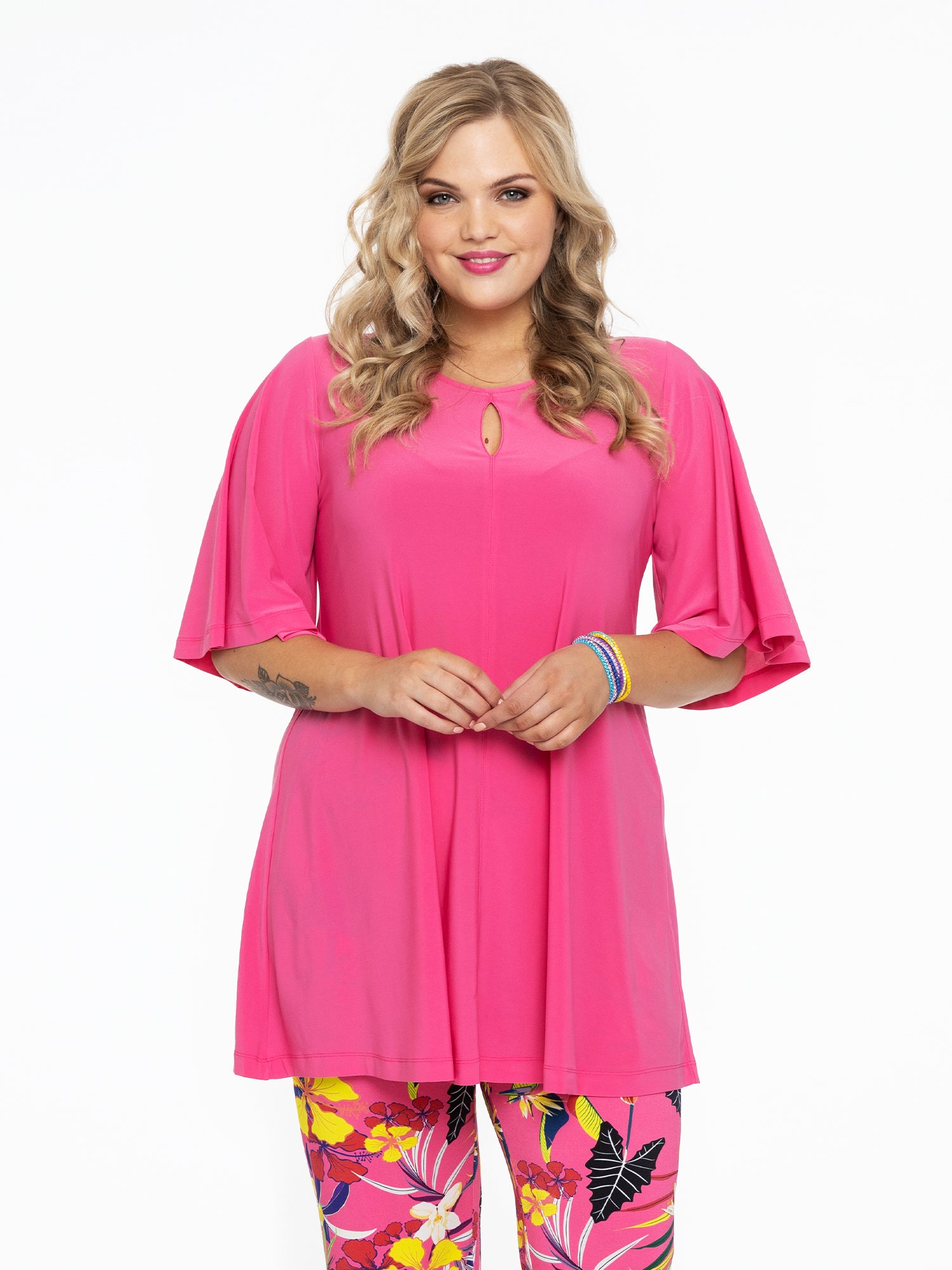 Een uitermate chique keuze is deze tuniek met charmante cirkelmouwen en een halslijn met kleine opening, welke een stukje huid toont. De tuniek is vervaardigd van het soepele dolce materiaal en heeft de Yoek wide bottom pasvorm. Zo'n tuniek die je in alle kleuren van de regenboog zou willen hebben!