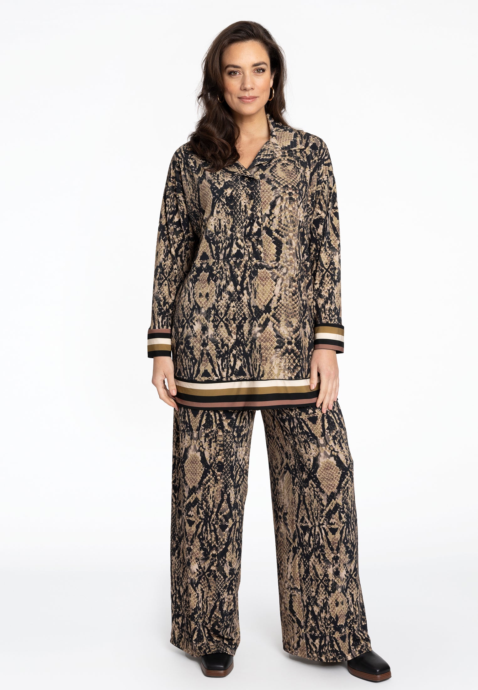 Deze wijde broek is gemaakt van comfortabel dolce-materiaal en is perfect om een verfijnde look voor elke dag te creëren! De broek is afgewerkt met een elegant slangendessin en heeft een elastische tailleband waardoor je het meeste draagcomfort hebt.