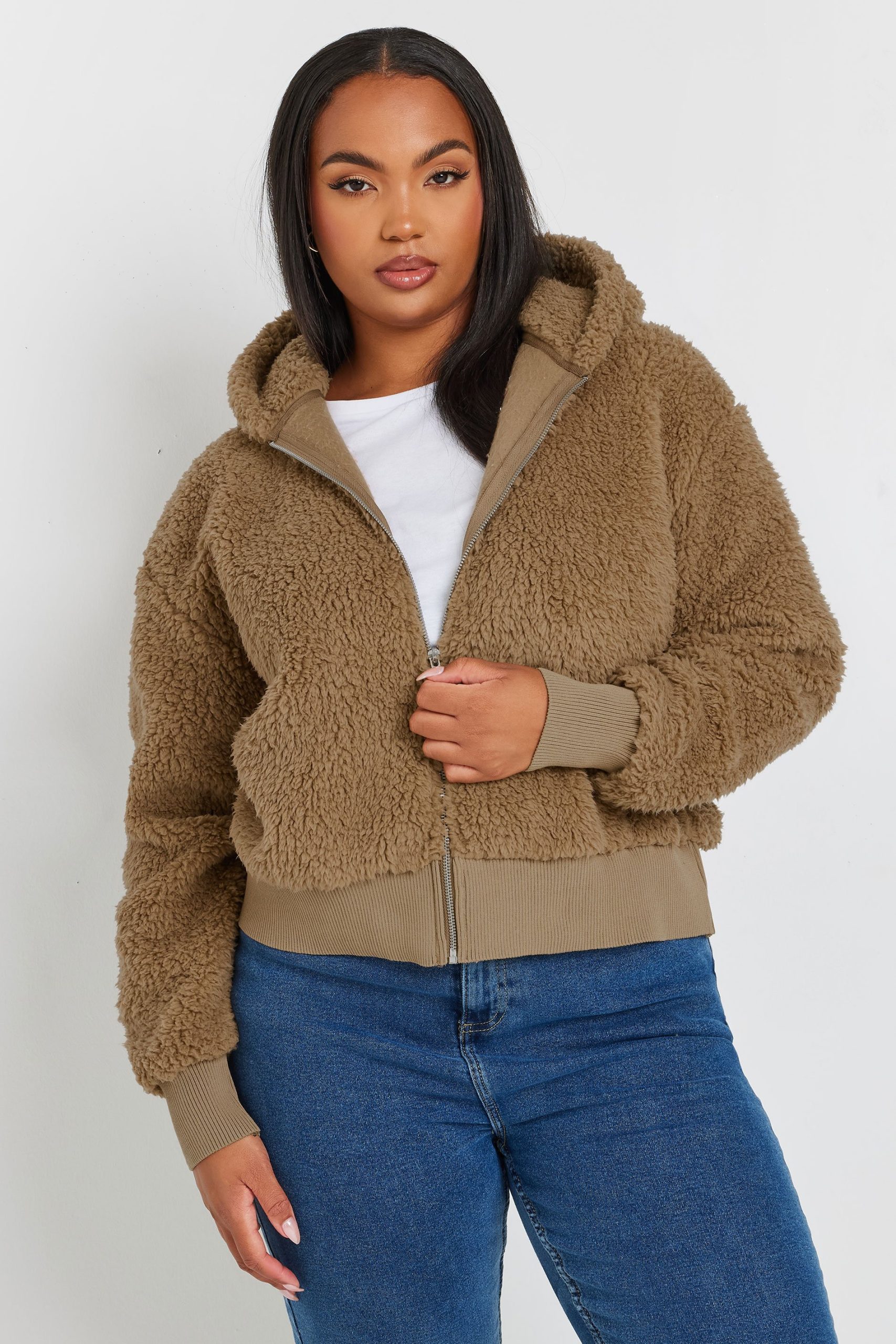 Yours Fleecejack Met Capuchon En Ritssluiting In Bruin, Women’s Curve & Plus Size, Yours