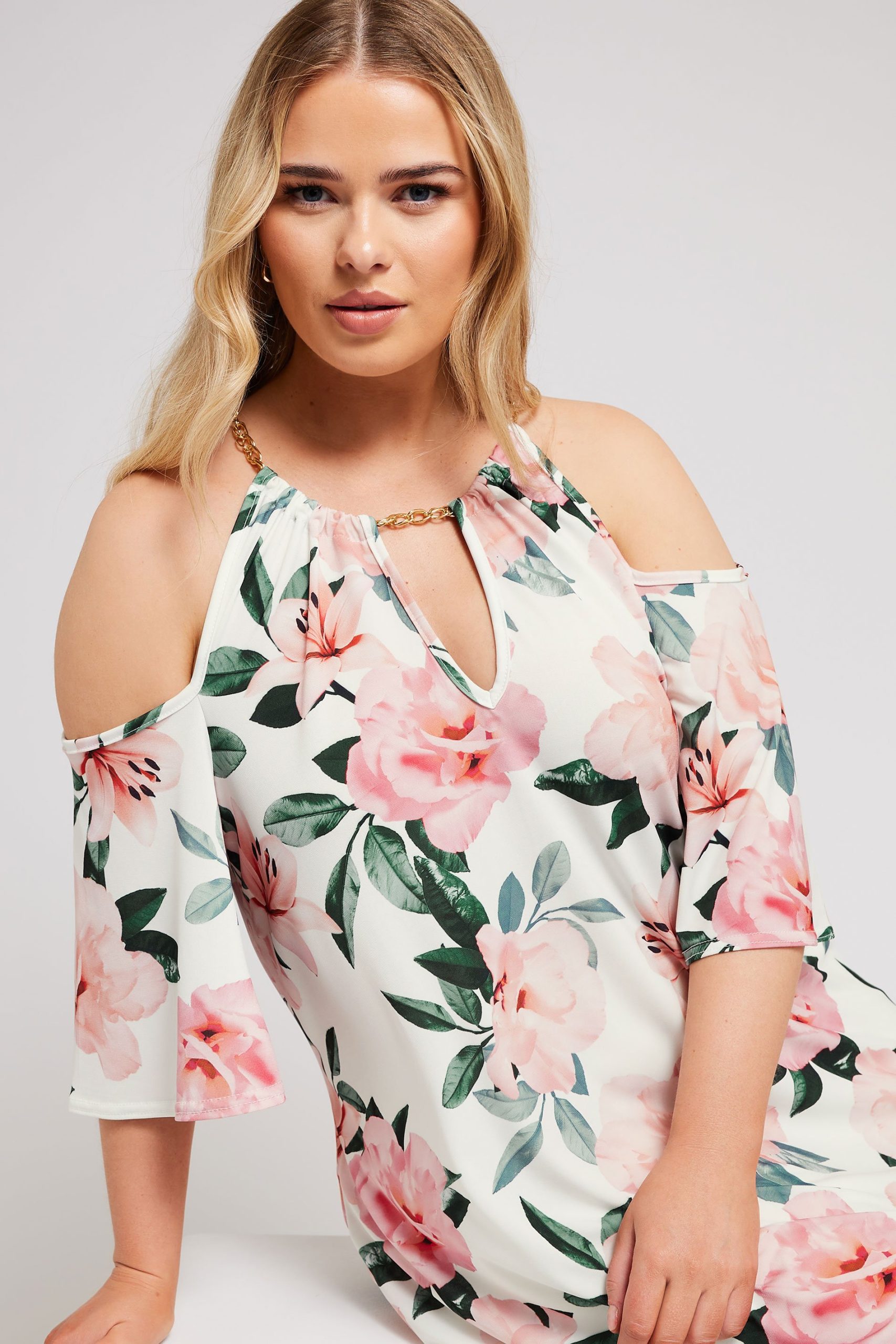 Home » Dames » Kleding » Grote maten » Tops & shirts » Yours London Top Met Bloemontwerp, Blote Schouders En Kettingdetail In Wit/Roze, Women’s Curve & Plus Size, Yours London