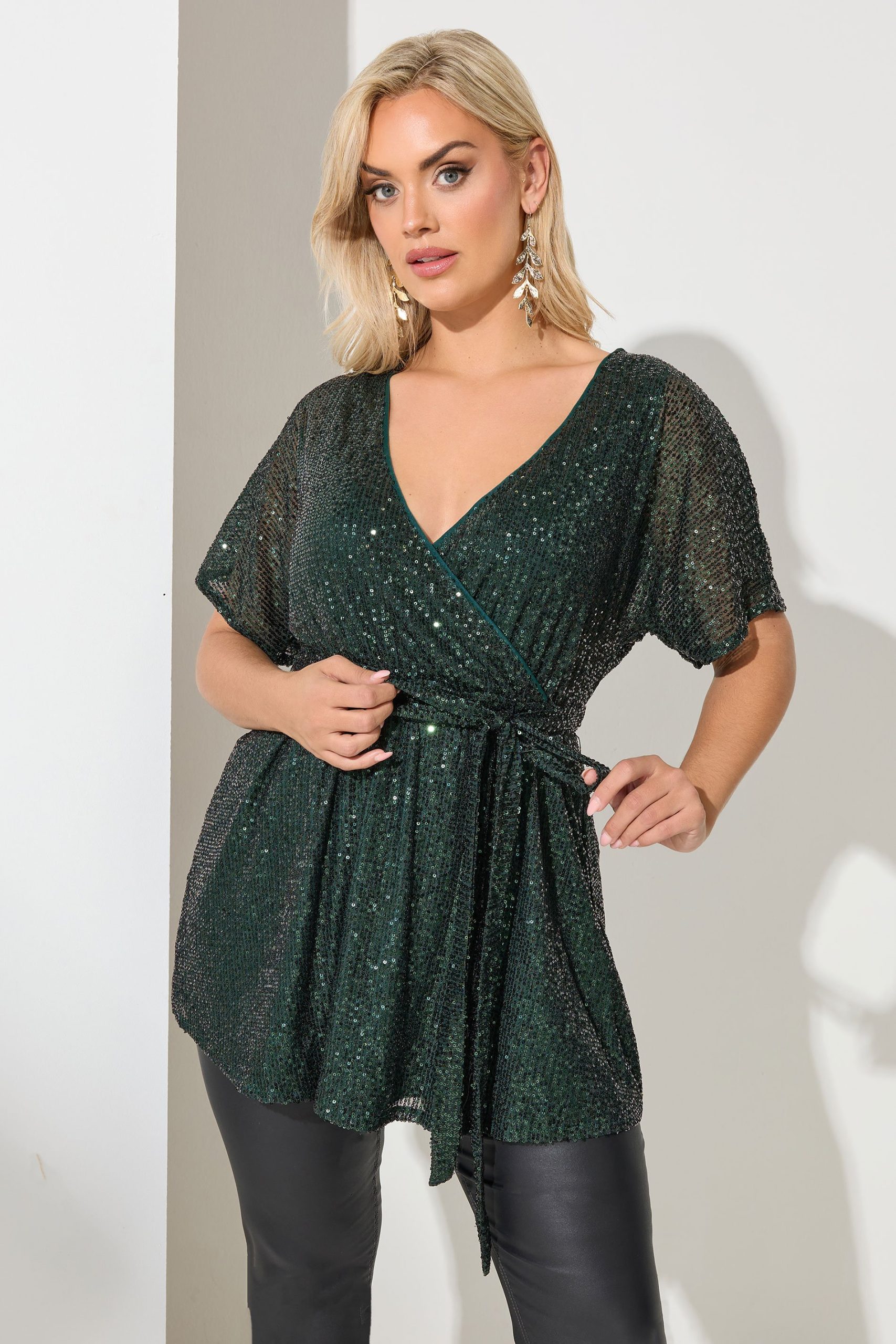Yours London Wikkeltop Met Korte Mouwen En Paillettenversiering In Donkergroen Size 58-60