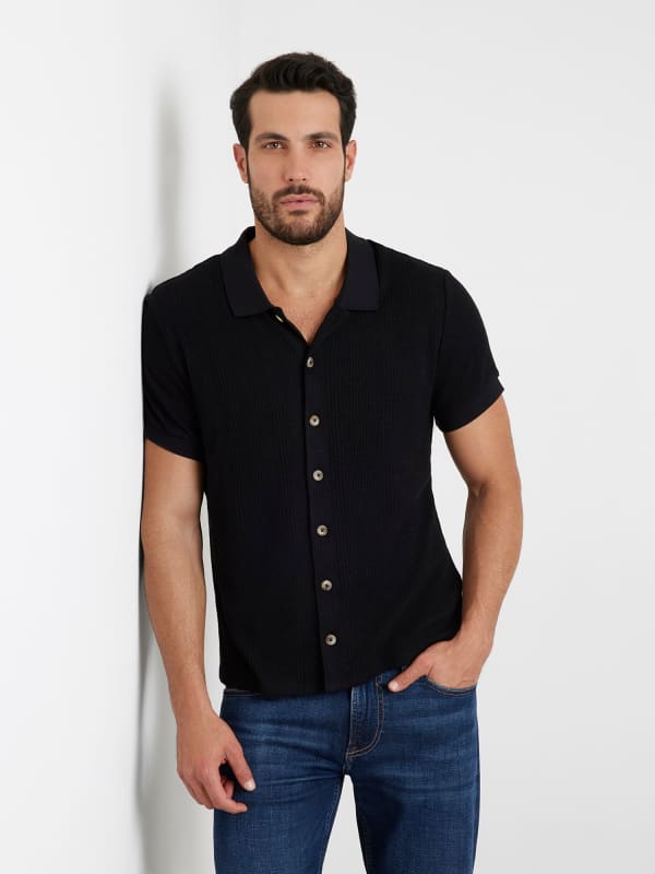 Trui/overhemd van gemengd viscose.Zacht gebreid overhemd.Klassieke kraag en korte mouwen.Regular fit.Sluiting met knopen.Het kledingstuk op de afbeelding is maat M.Valt normaal op maat.Totale lengte: 68,58 cm / 27 inch.