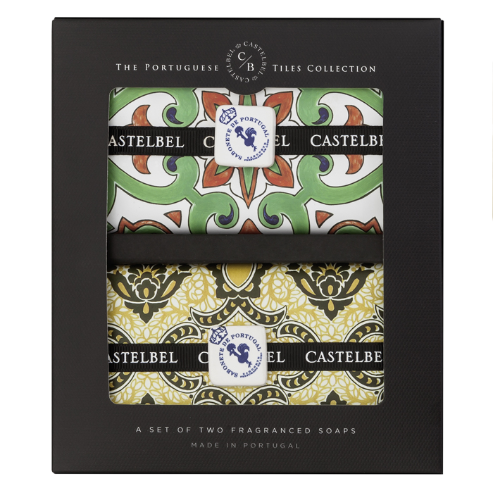 Cadeaudoosje met 2 zepen uit de Portuguese Tile Collection van Castelbel. Elk Castelbel zeepje wordt met de hand vervaardigd en ingepakt om de hoogste kwaliteit en perfectie te garanderen. Om ieder zeepje is een zwart satijnen lint aangebracht voorzien van een klein keramisch tegeltje.Inhoud:- Vanilla&Amberzeep 200 gr (vanille&amber)- Cilantro&Lime zeep 200 gr (koriander&citroen)