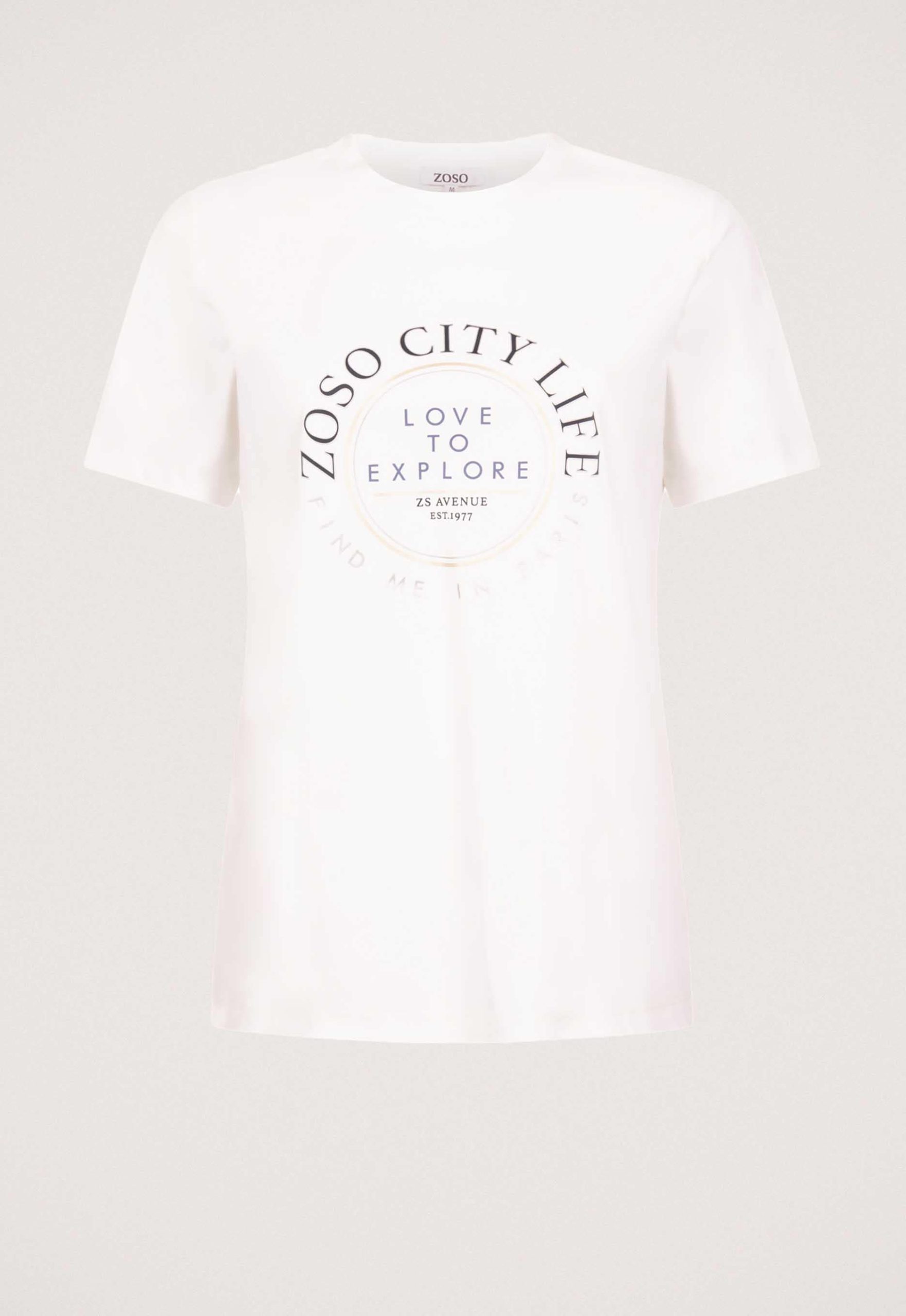Dit is het Selma T-shirt van het merk ZOSO Fashion. Dit T-shirt heeft een ronde hals en een print op de voorkant.